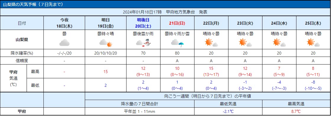 甲府地方気象台によると、1月20日夕方から21日にかけ雨や雪となる予報です。