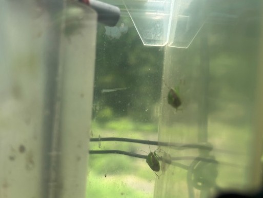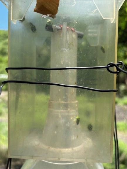 6月5日、南アルプス市白根のフェロモントラップを覗いてみました。午前中に新しく設置したばかりとのことでしたが、中にはすでにカメムシが数匹…!