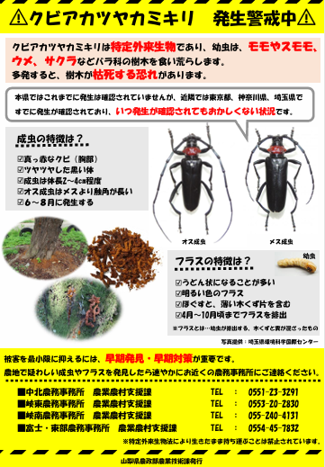 農政部農業技術課からクビアカツヤカミキリの注意喚起が出されました。