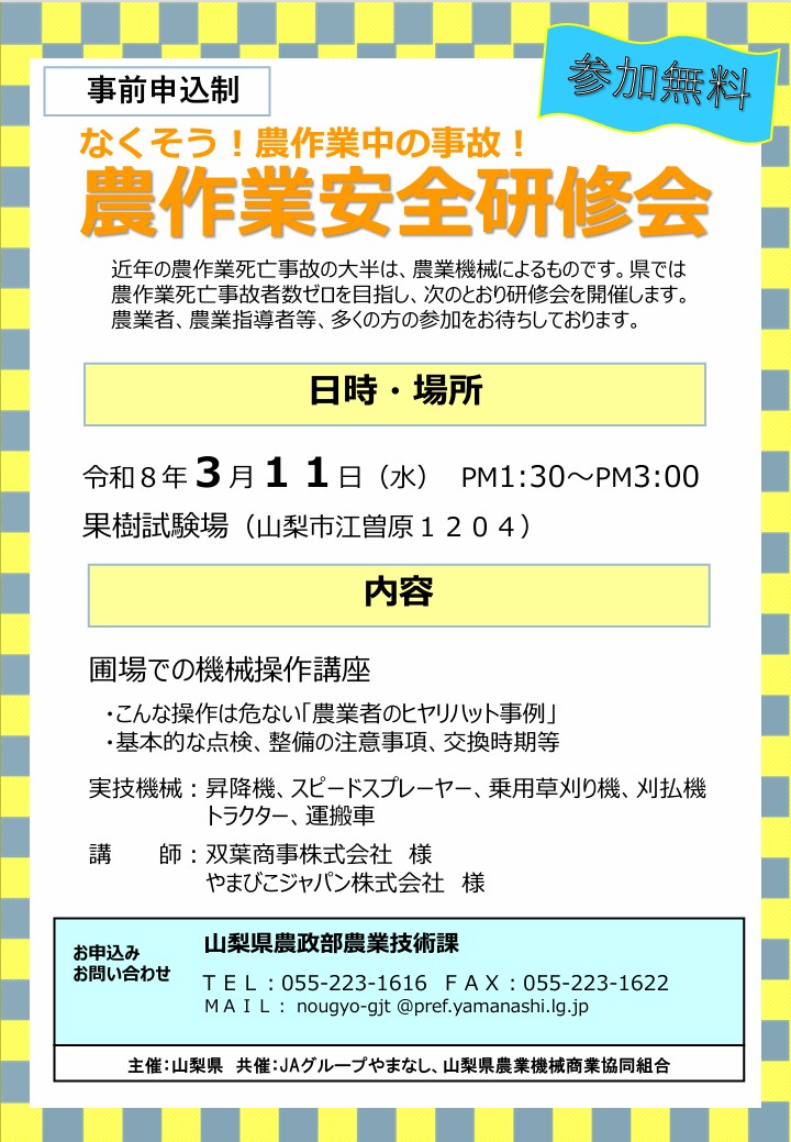 山梨県では、農作業死亡事故ゼロを目指し、農作業安全研修会を開催しています。慣れている作業の中にも危険な機械操作があるかもしれません。作業が本格化する前に、研修に参加して機械の点検、整備、操作方法を確認しましょう。