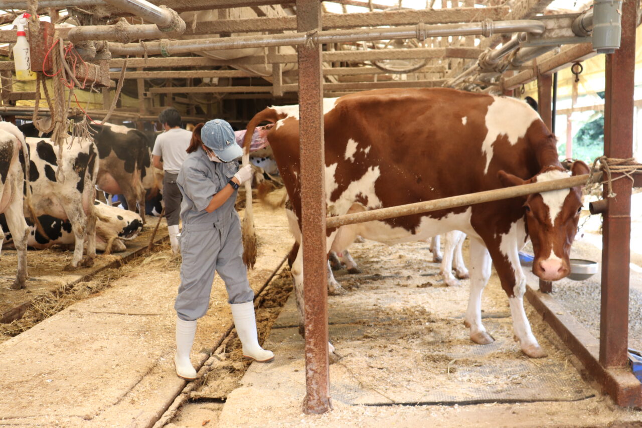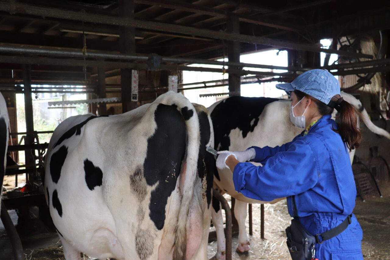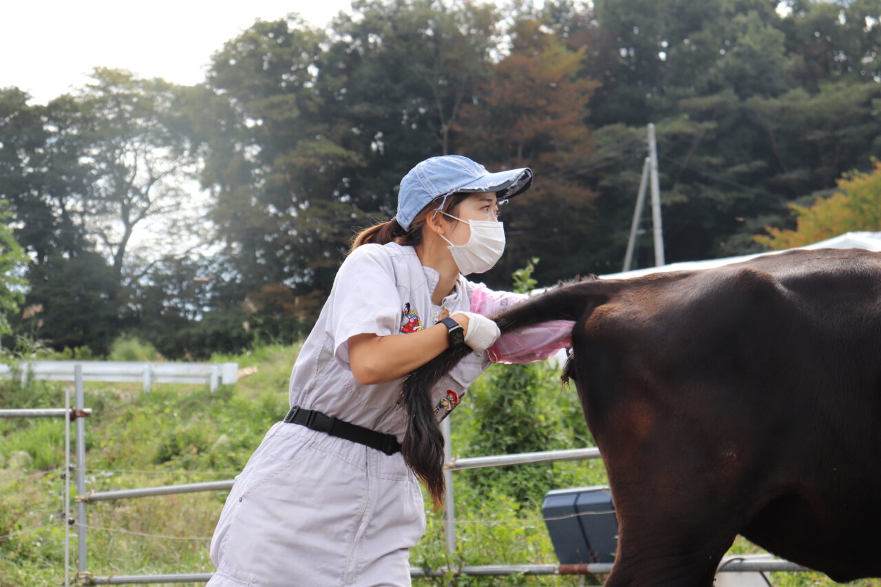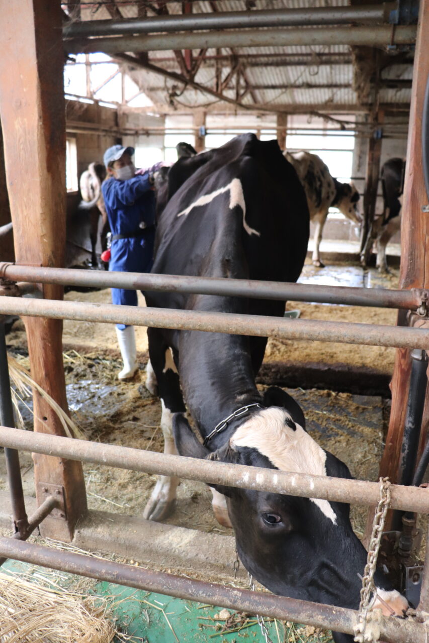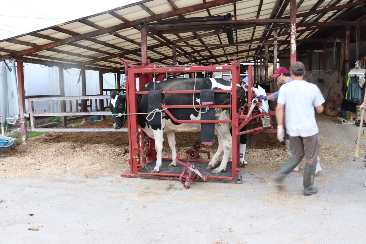 9:30 2件目。別の肉牛農家さんへ。繁殖和牛に直腸検査をして、卵巣や子宮を触り、状態を確認します。