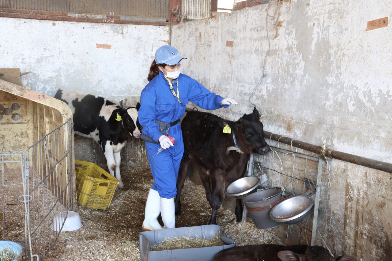 9:00 1件目。肉牛農家さんの子牛に貧血予防の鉄剤を注射。