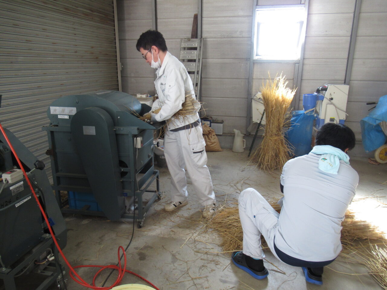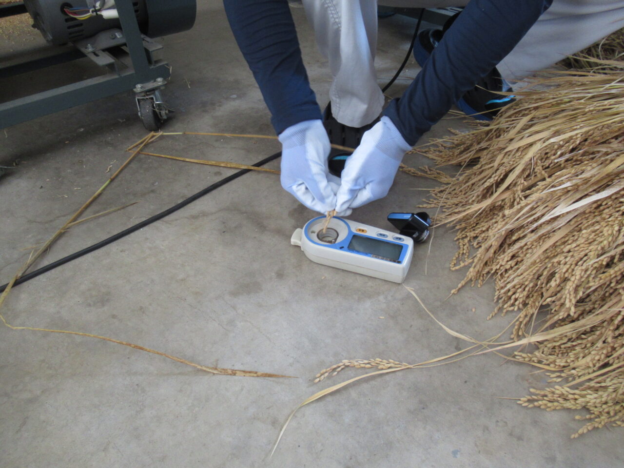 この日は北部支所で実測が行われました。実測では、1筆につき10株×6カ所を手刈りします。刈り取った稲は、脱穀(穂からもみを取る)→乾燥→もみすり(もみから玄米にする)→選別→ふるいにかける、という工程で調製し、玄米重を量って被害筆の収量を計算していきます。