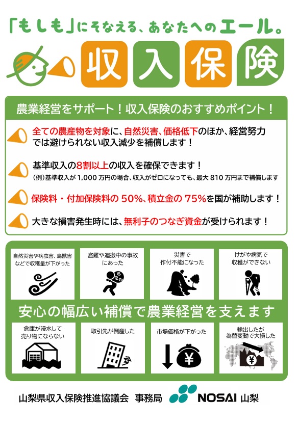 自然災害等による収量減少に加え、市場価格低下、けがや病気で収穫できない、倉庫が浸水して売り物にならない、取引先が倒産、盗難や運搬中の事故、輸出時の為替変動、新型コロナウイルス感染症拡大対策の影響など、農業者の経営努力では避けられない「収入の減少」が補償の対象です。