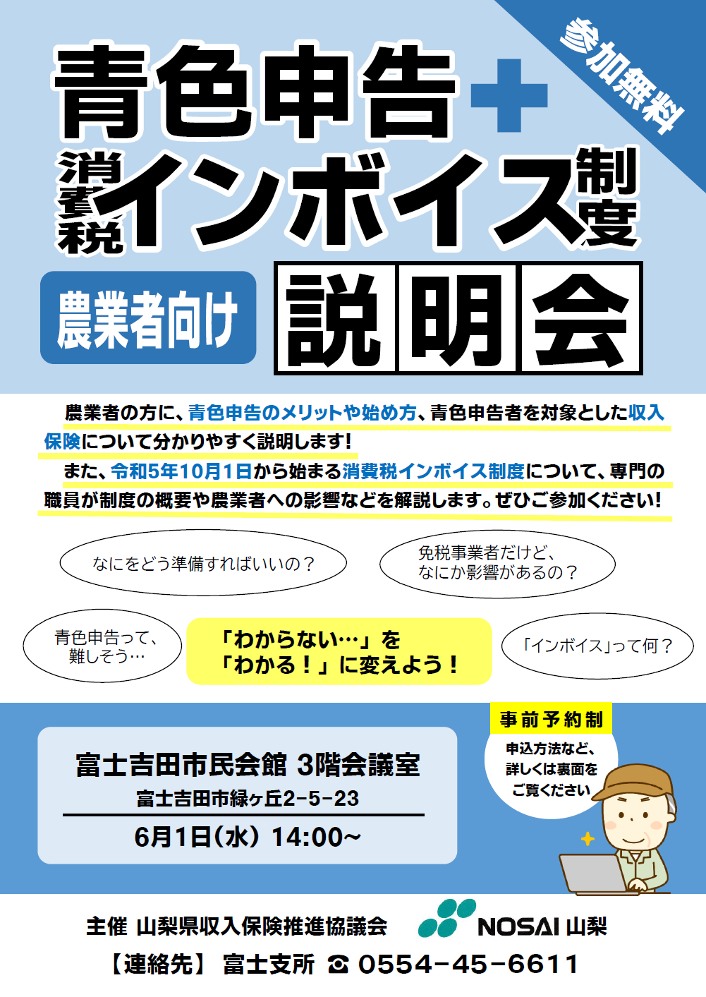 NOSAIでは、より多くの方に青色申告を行っていただき、収入保険制度へ加入していただくため、青色申告およびインボイス制度の説明会を県内各地で開催しています。新たに、富士吉田市での開催が決まりましたので、お知らせします。