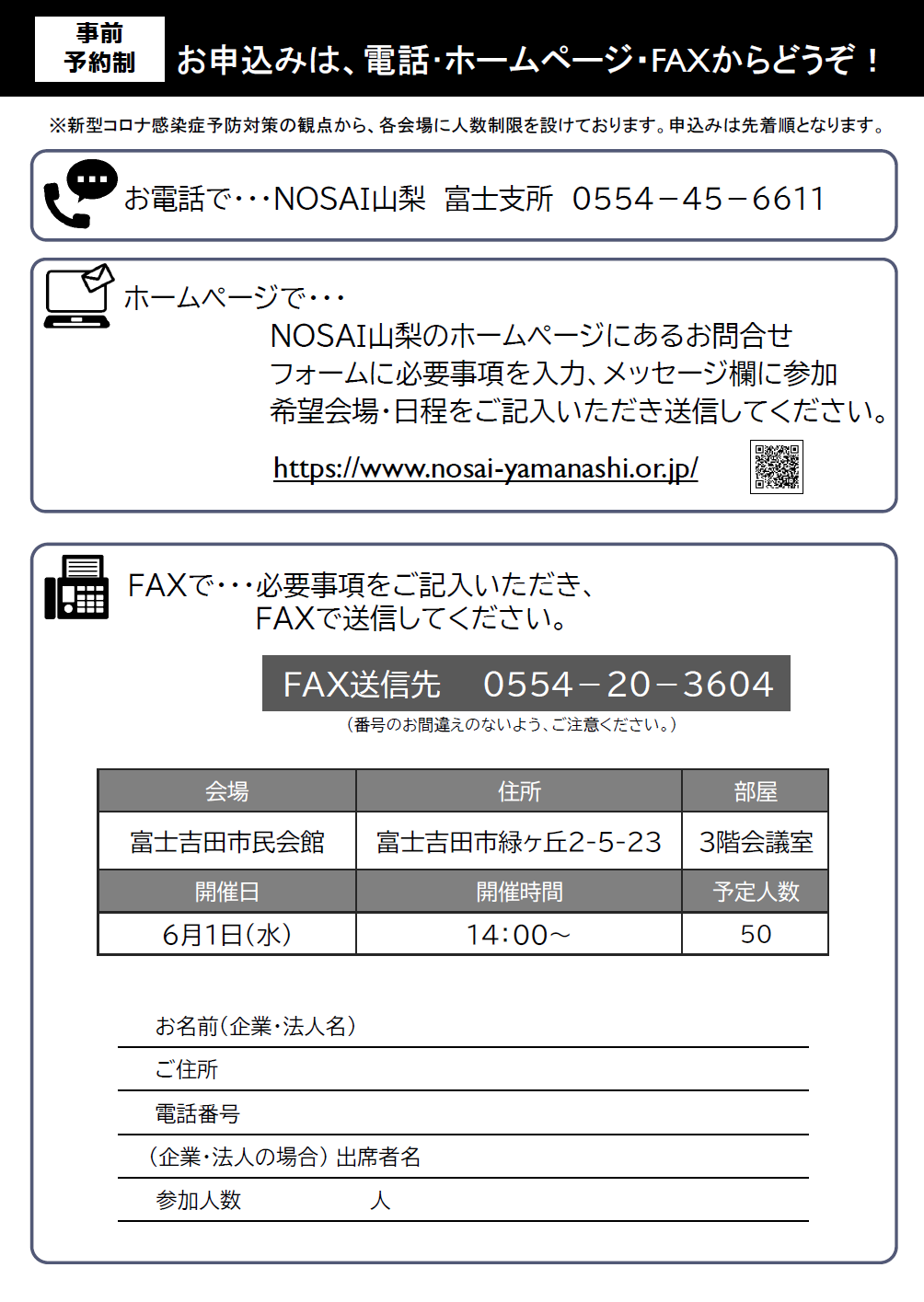 お申し込みは、NOSAI山梨の各支所・本所へ。電話・FAX・ホームページのお問い合わせメールフォームで受け付けています。