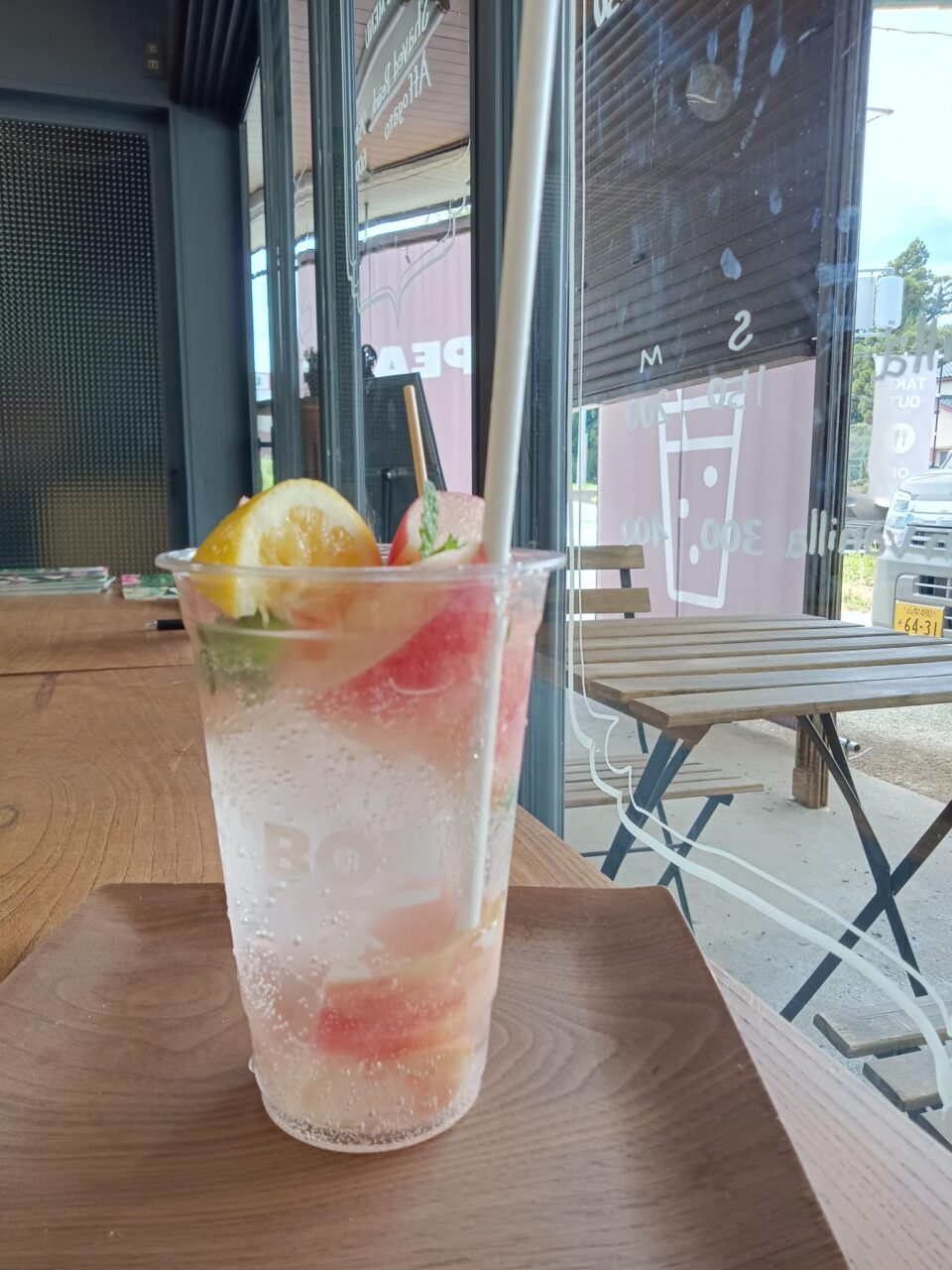 皮付きの桃がごろごろ入っていて、ミント、レモンでさっぱりしたサイダーです。甘くないので、飲みやすく、冷えた桃もいただけて大満足の一品でした。おいしかったです!写真映えもしますよ。