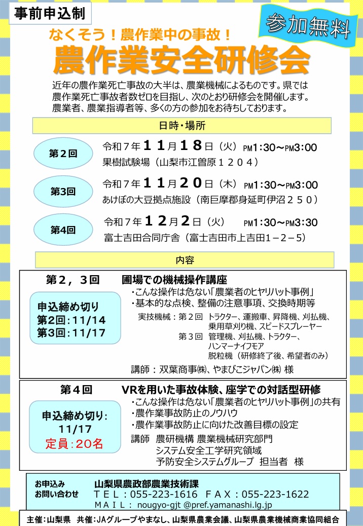 さて、今回は山梨県が開催する農作業安全研修会についてです。毎年山梨県でも多くの農作業事故が発生しています。農作業死亡事故ゼロを目指し、今一度作業方法を見直しましょう。
