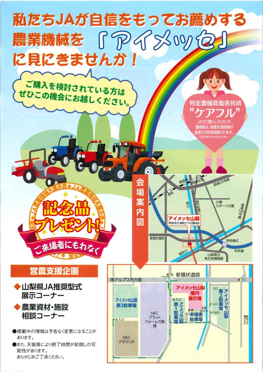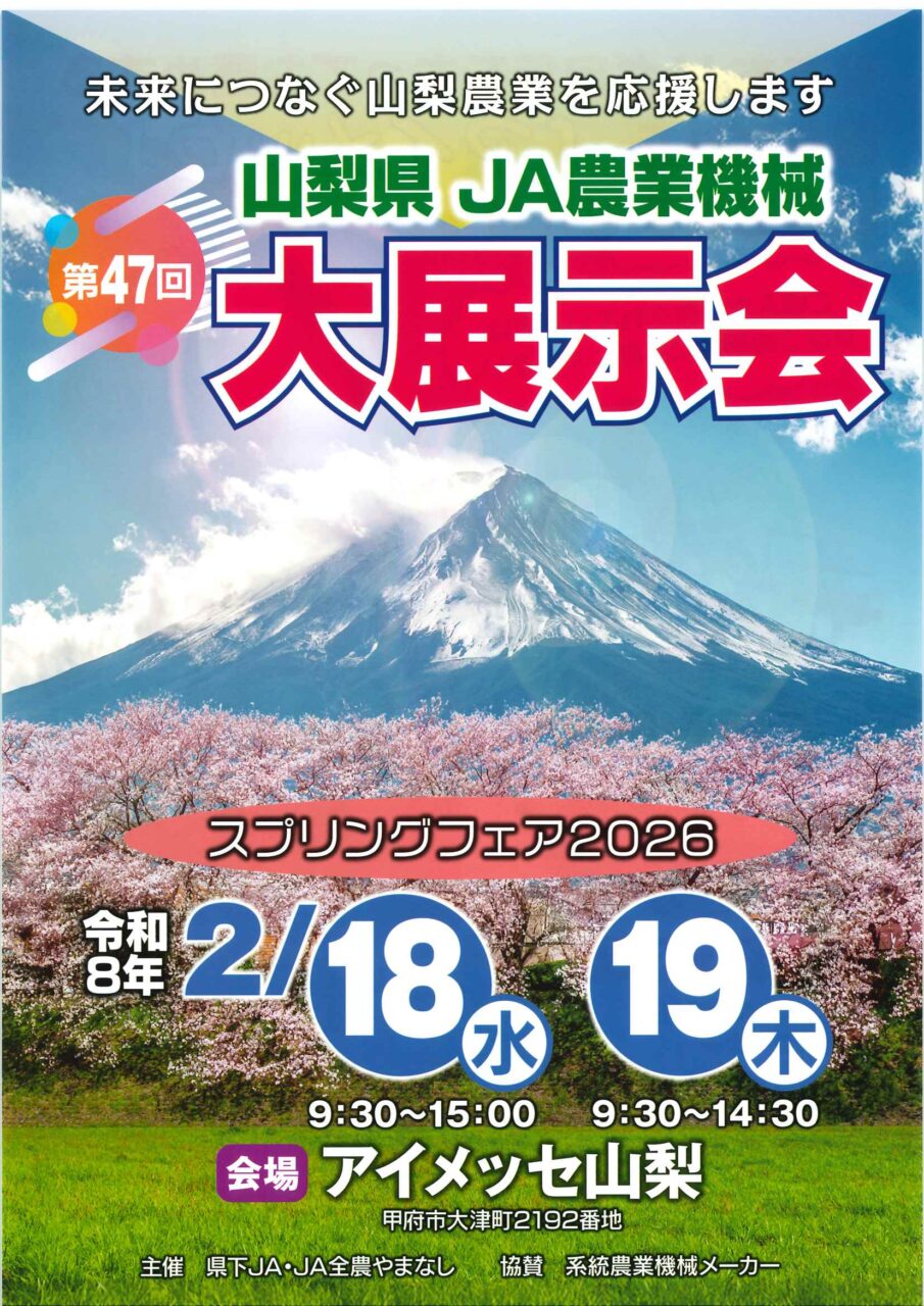 第47回山梨県JA農業機械大展示会が令和8年2月18日(水)と19日(木)の2日間開催されます。場所は甲府市のアイメッセ山梨屋内展示場で、たくさんの農業機械が一堂に集まります。購入をご検討されている方は、ぜひご来場ください。