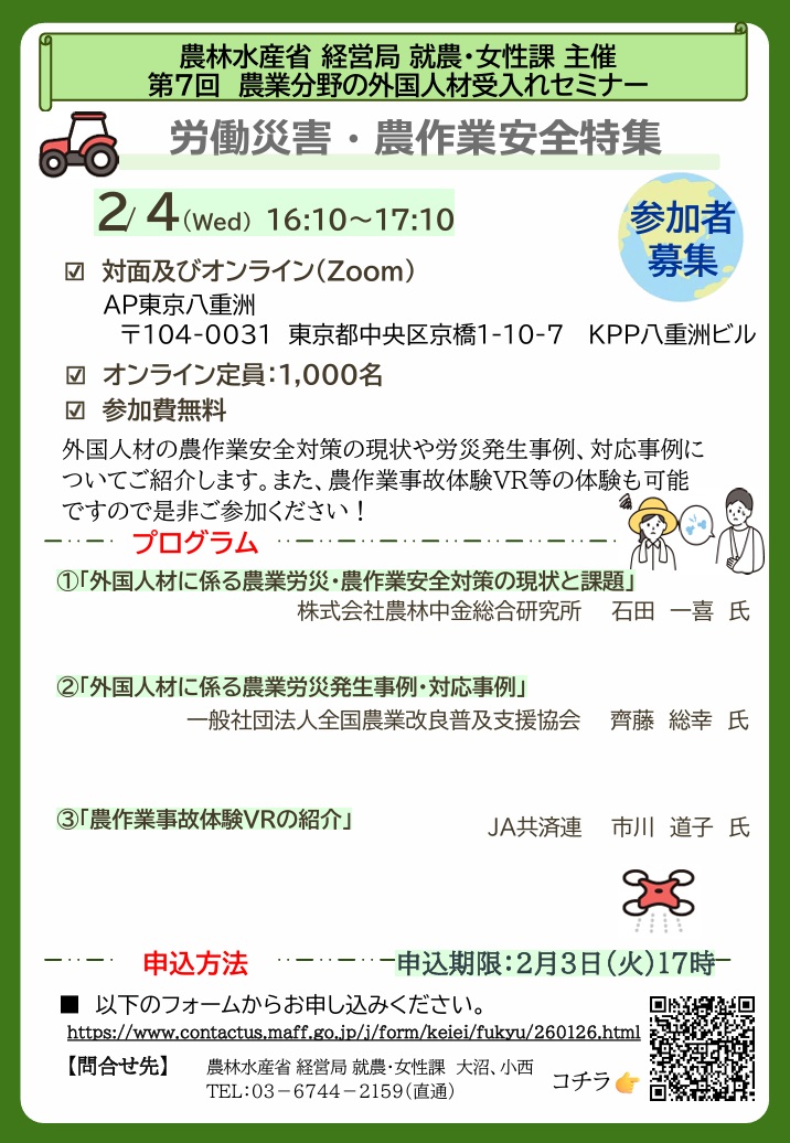 2月4日に農林水産省経営局就農・女性課主催で、の外国人材受入れセミナーが開催されます。外国人材の農作業安全対策の現状や労災発生事例、対応事例について講演があるそうです。