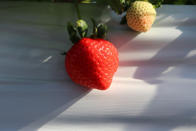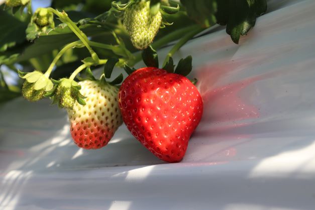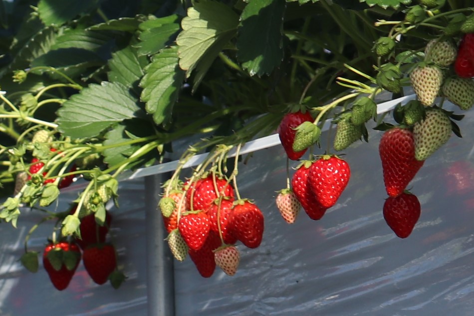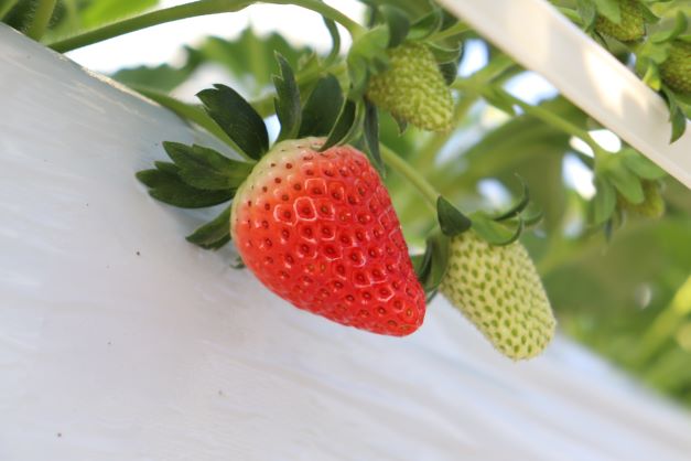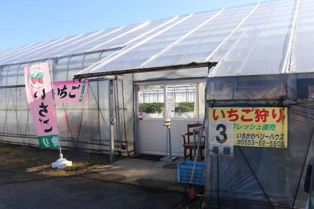 市川さん家族が経営するイチゴ狩りハウスは、フルーツ公園の麓にある「いちごランド」の3号棟です。今年は12月23日(木)からオープンします。オープン直前のハウスでは、すでにたくさんのイチゴが赤く色づいていました。