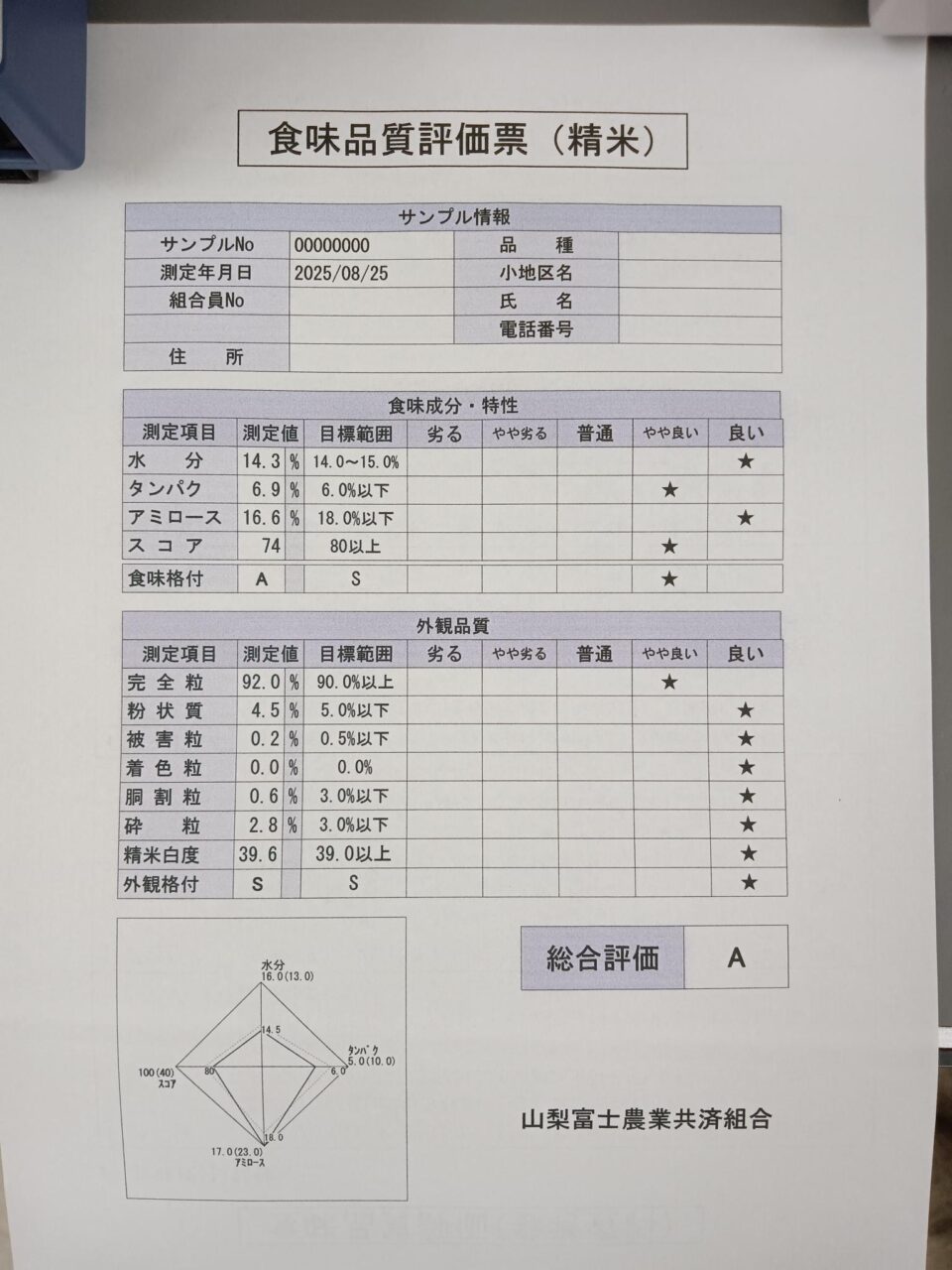 テストでは令和3年産の政府備蓄米を入手したので、診断してみました。結果は外観品質S、食味Aの高評価でした。白米なので品質は高いとして、実際に炊いて食べてみた感想としては普通にいただける味だと思ったので、数字で証明されてほっとしたところです。診断後は写真のような「食味品質評価票」を発行します。