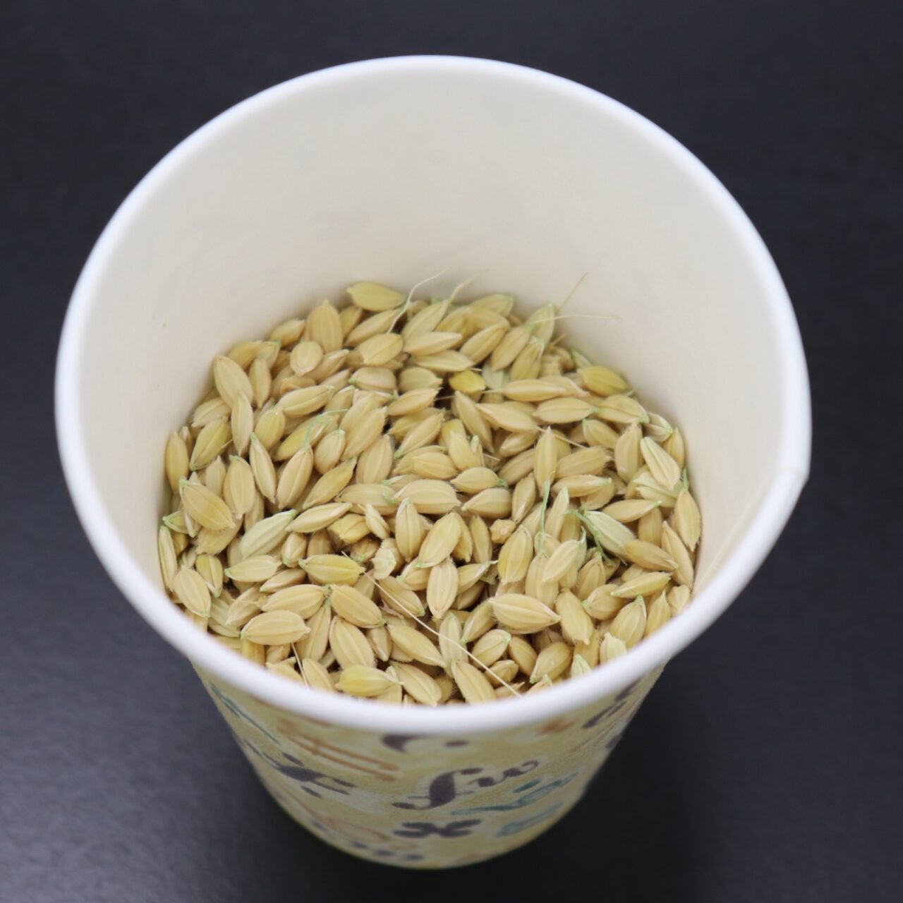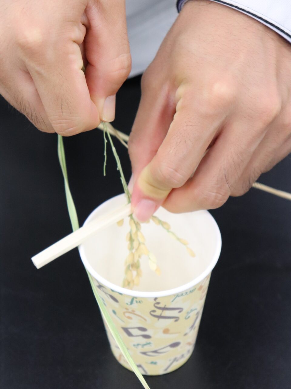 2. そのまま紙コップの上で茎を引っ張ると籾が外れて下に落ちます。