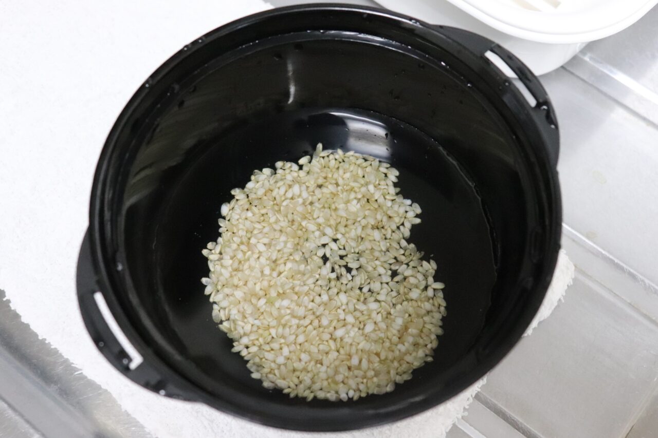 6. 浸水が終わったら、炊飯器の指示する水分量を加え玄米モードで炊きます。