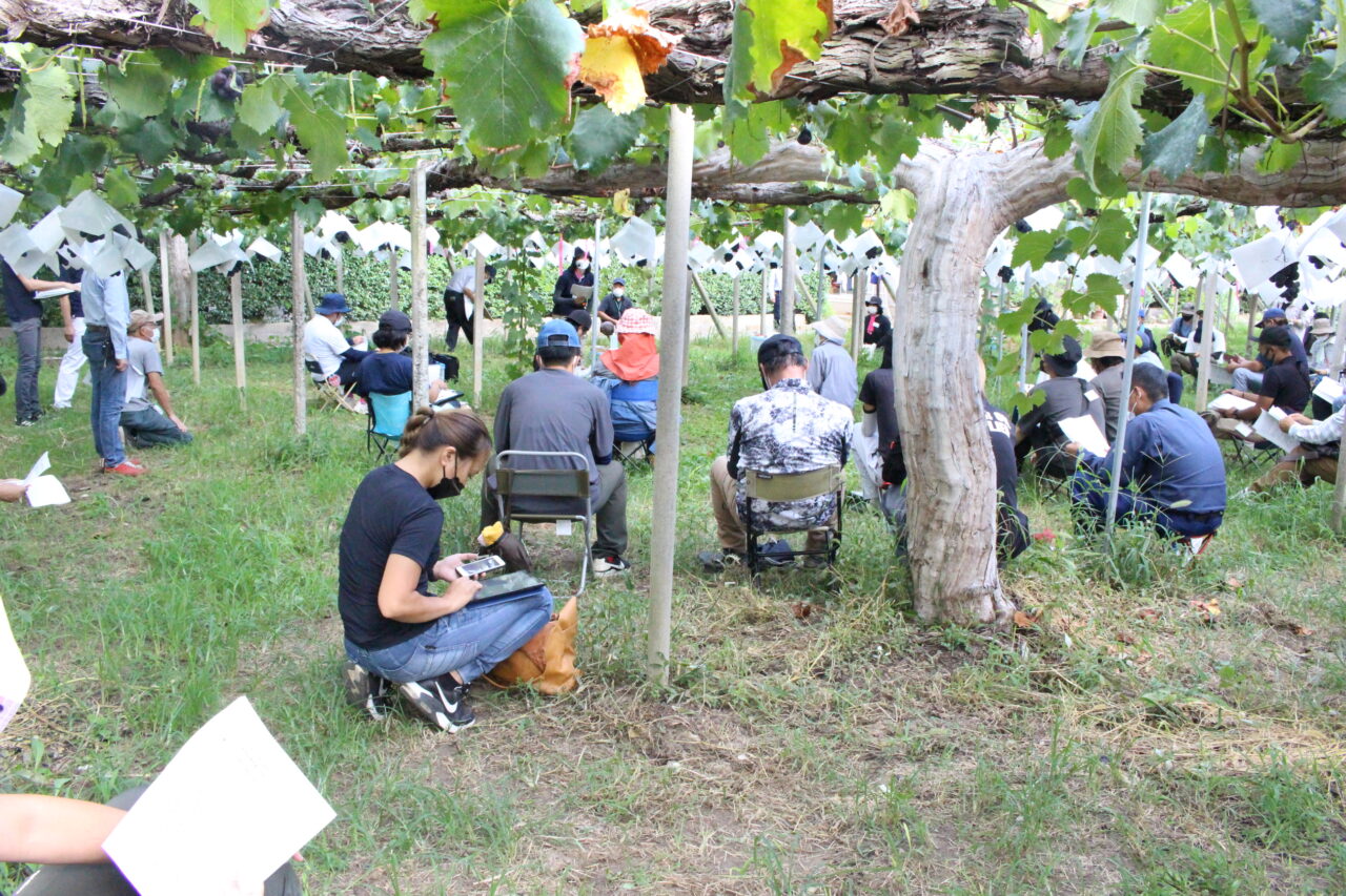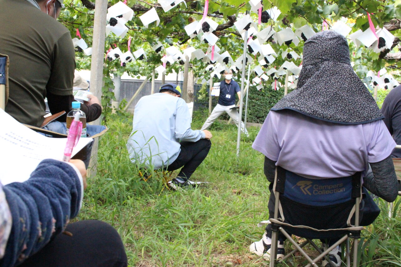 セミナーではブドウの生育状況の確認や、栽培相談会などが行われ、参加した50人ほどの農家さんは、皆さんメモを取りながら熱心に聞いていました。