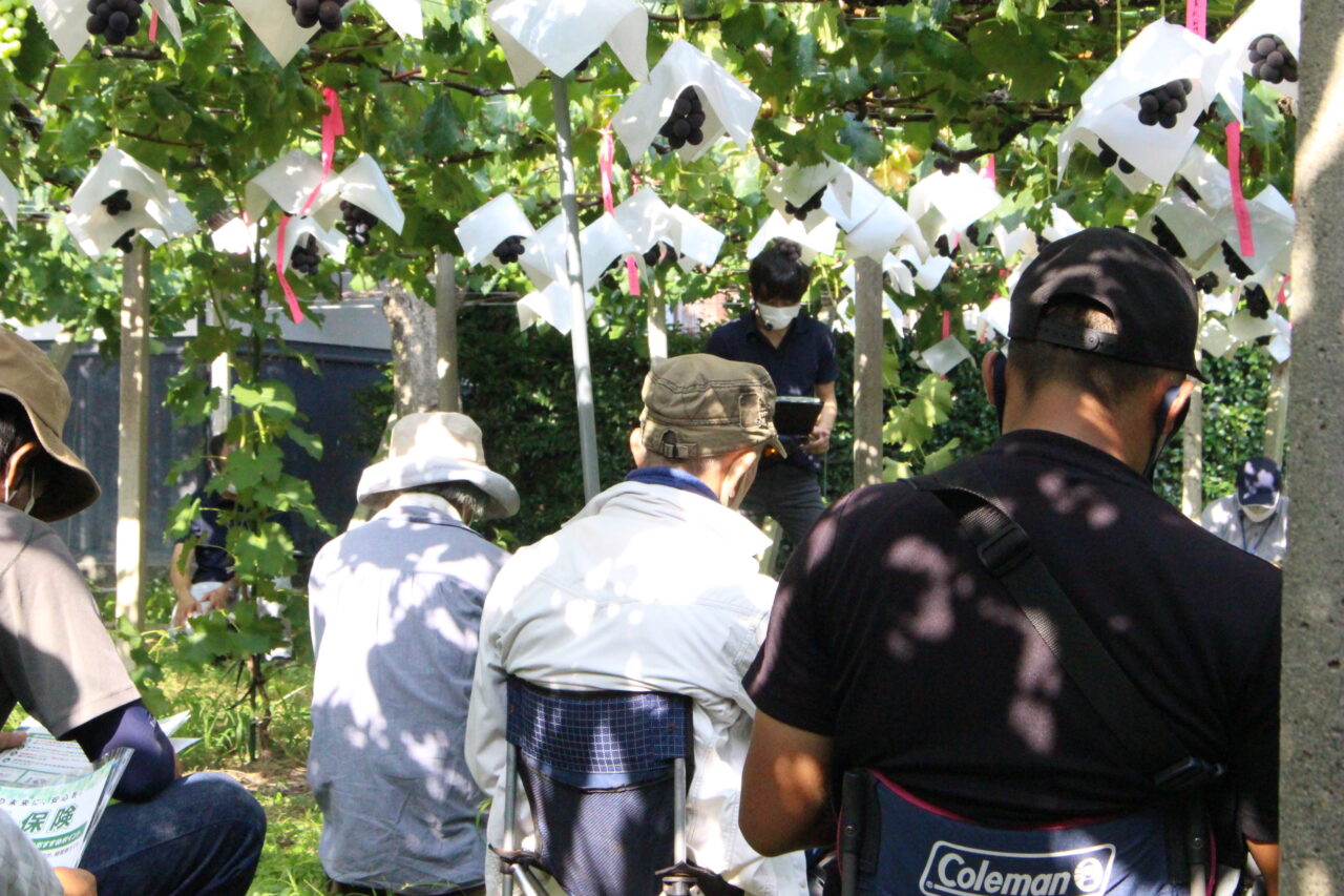 8月9日、峡東農務事務所主催の「果樹技術向上セミナー」が笛吹市春日居町のブドウ園地で開催されました。
