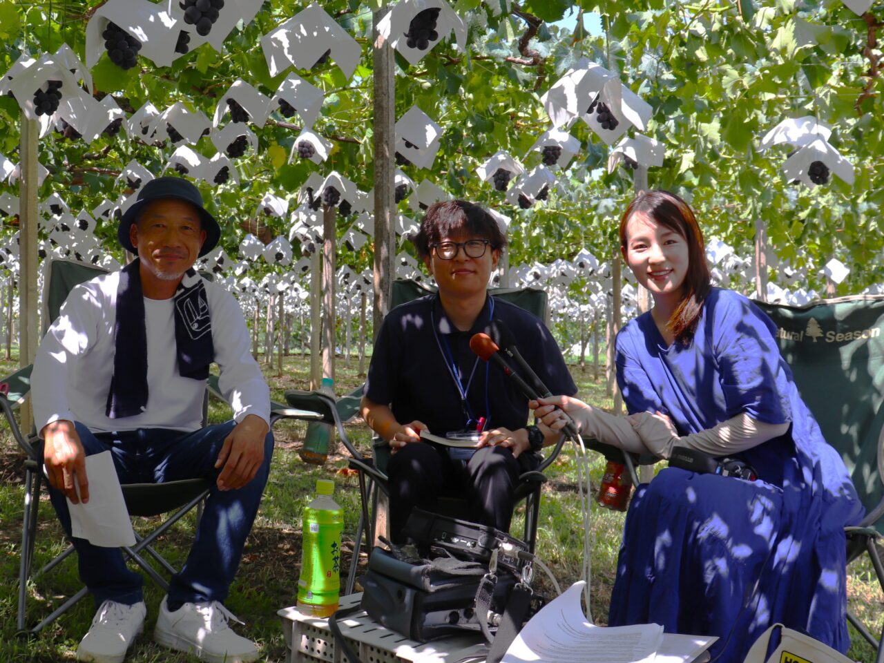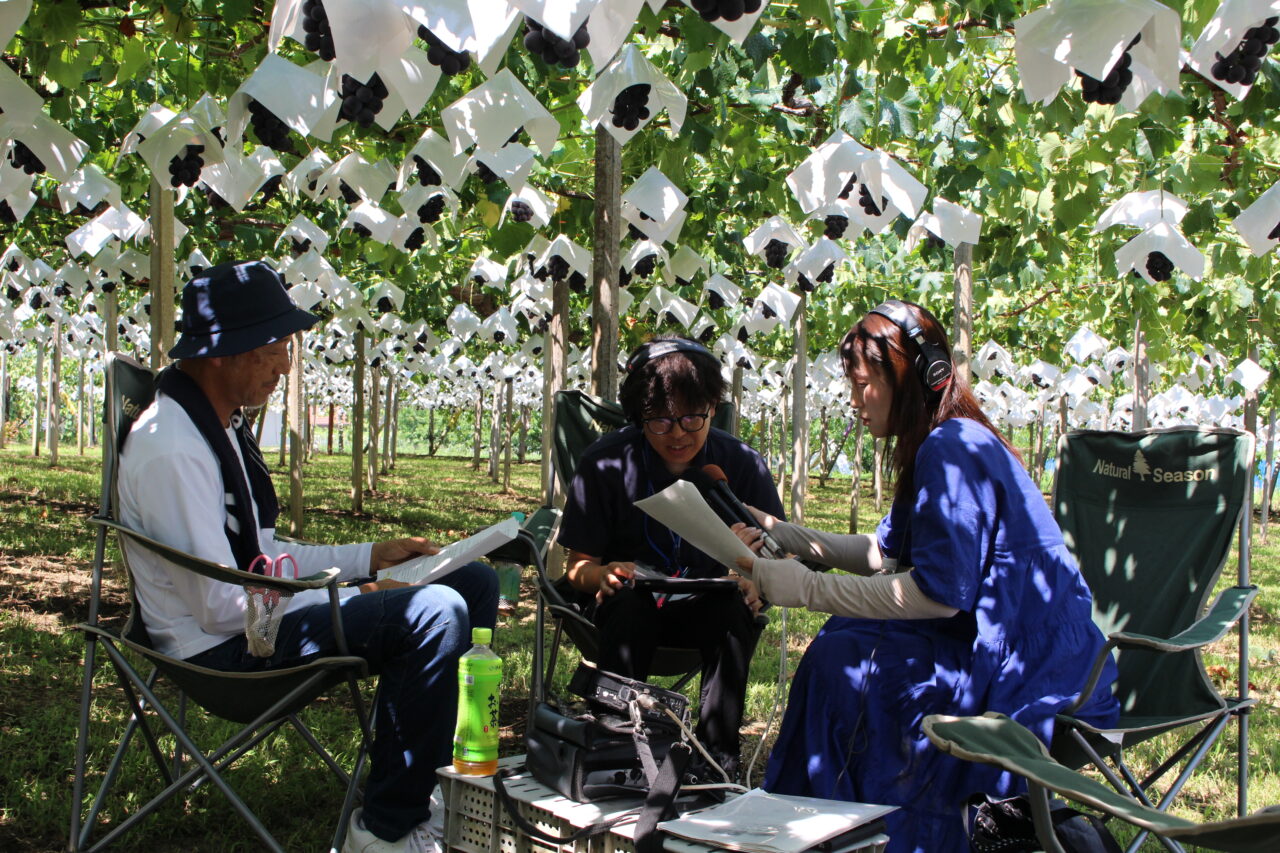 加賀美様のブドウ園の棚の下で放送ということで、ブドウ(巨峰でした)の香りが漂うなか打ち合わせをして放送となりました。